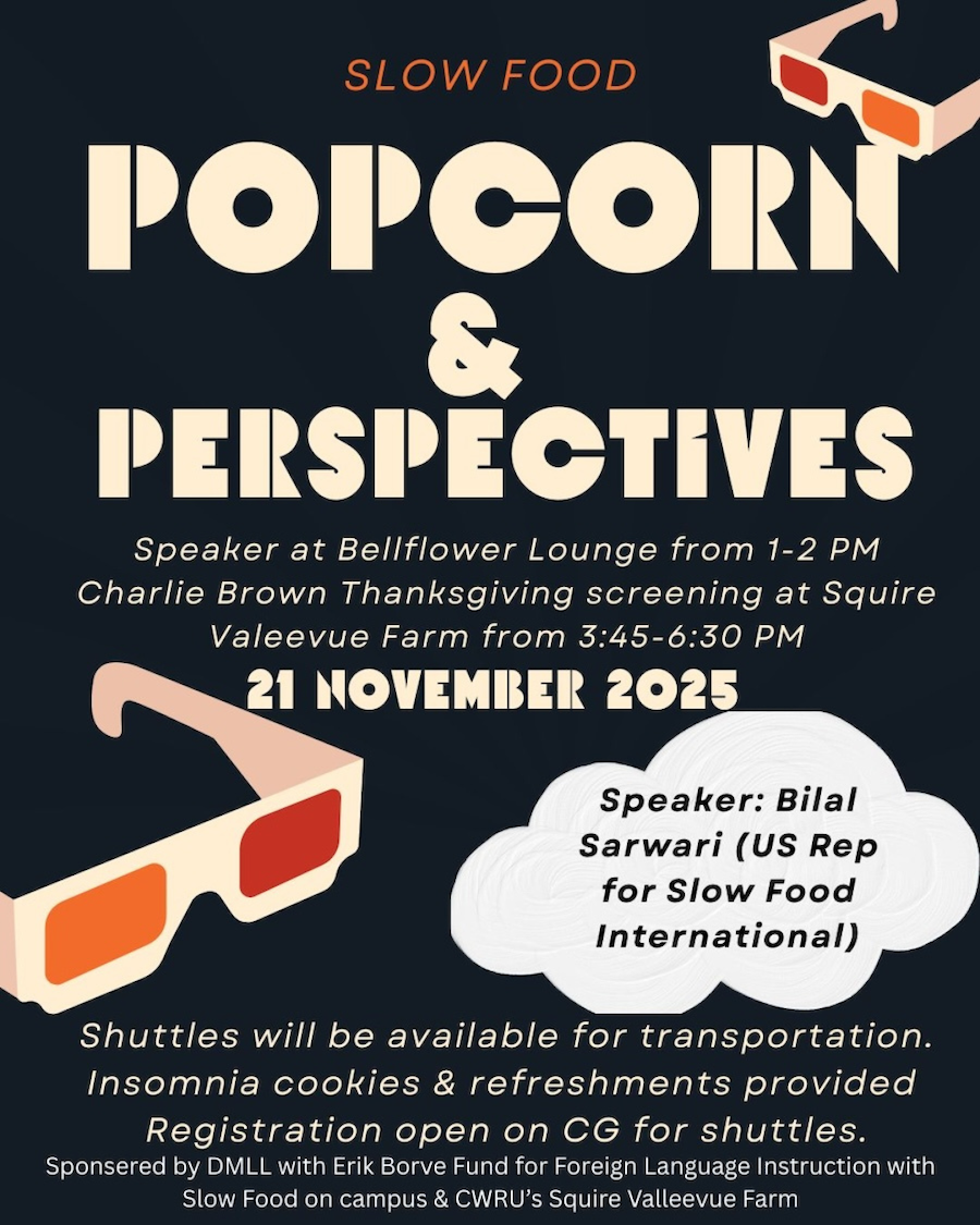 Please join a visit with Bilal Sarwari, who is currently the US Representative to Slow Food International, on Friday, November 21. He came to CWRU last year while he was the interim director of Slow Food USA. There will be a talk 1-2 pm in the Bellflower Lounge in Thwing Center, free and open to all. Then, he will visit CWRU’s Squire Valleevue Farm to mingle with students & attendees, and tour with the staff there, also free and open to all. Registration is available on CampusGroups. A shuttle will be provided to transport students from the campus to the farm. The Eirik Borve Fund for Foreign Language Instruction is supporting this event, co-sponsored by the DMLL program in Italian, the recognized campus student organization Slow Food on Campus, and CWRU’s Squire Valleevue Farm.