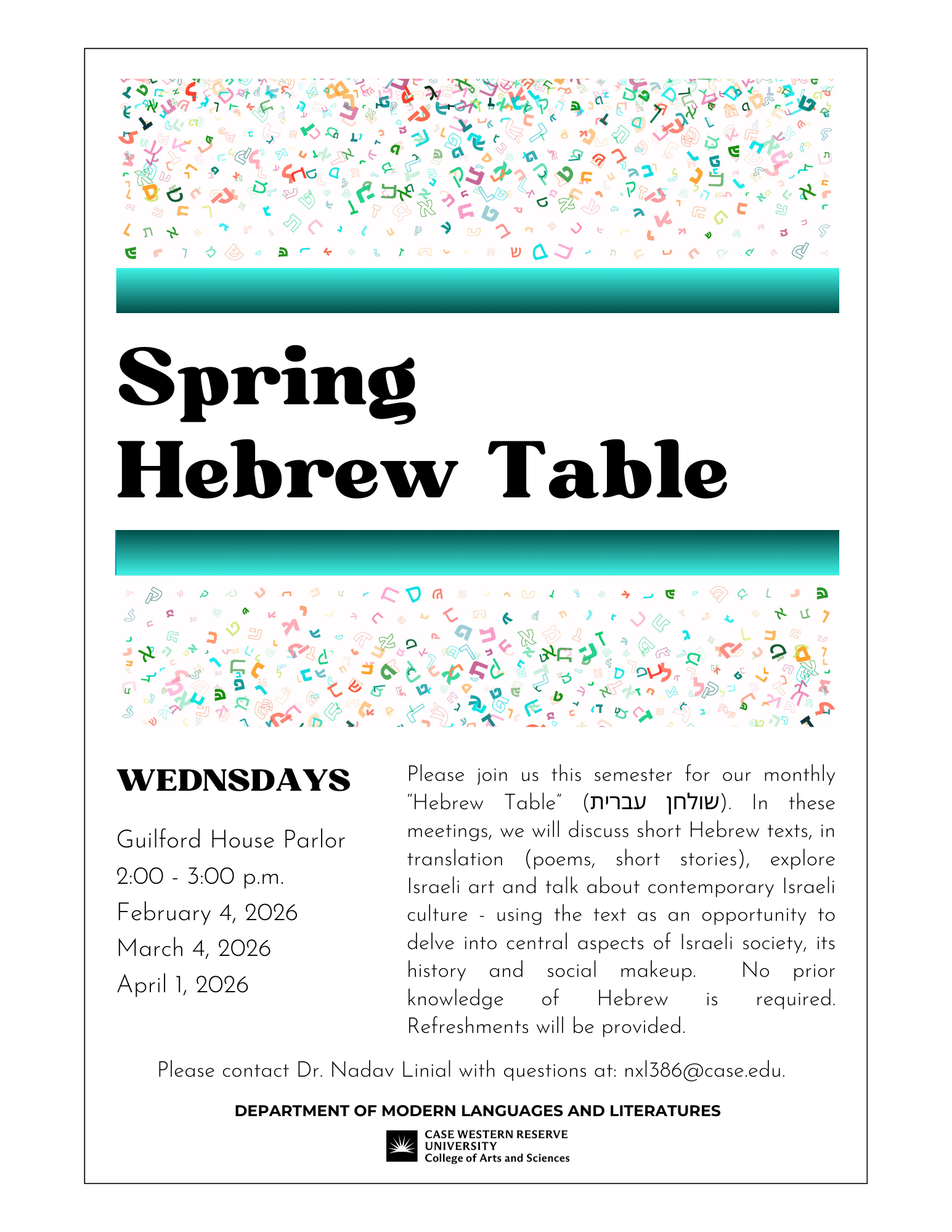 Please join us this spring for our monthly Hebrew Table. In each meeting we will explore artwork, poetry, music, architecture, holidays and traditions central to Israeli and Hebrew culture. The meetings will be run in English, there is no need (or expectation) of prior knowledge of Hebrew.