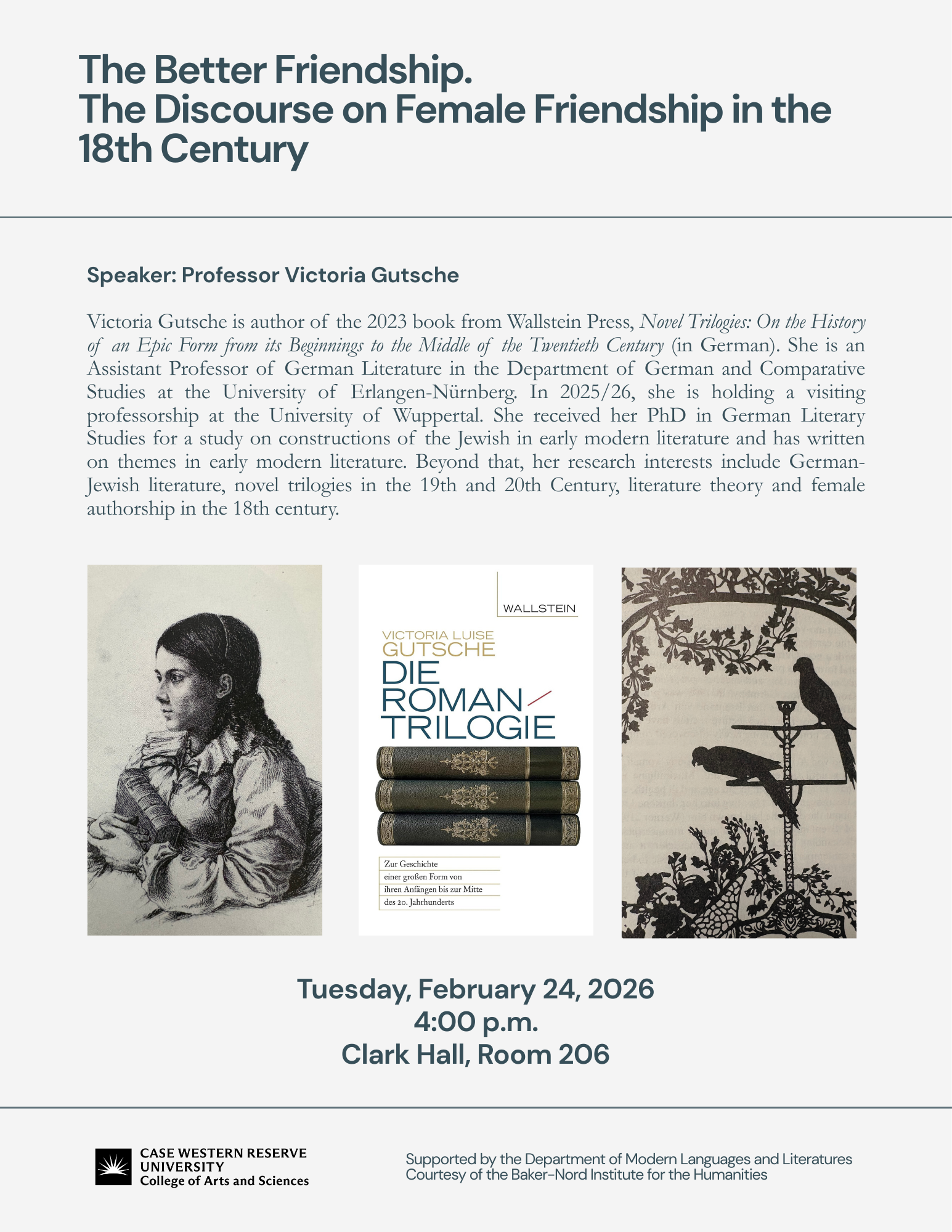 Professor Victoria Gutsche from the University of Erlangen-Nürnberg, Germany will give an open lecture on Women’s Literary Friendship in the Baker-Nord Institute for the Humanities, Clark Hall 206. This event is open to all interested in literature and culture.
